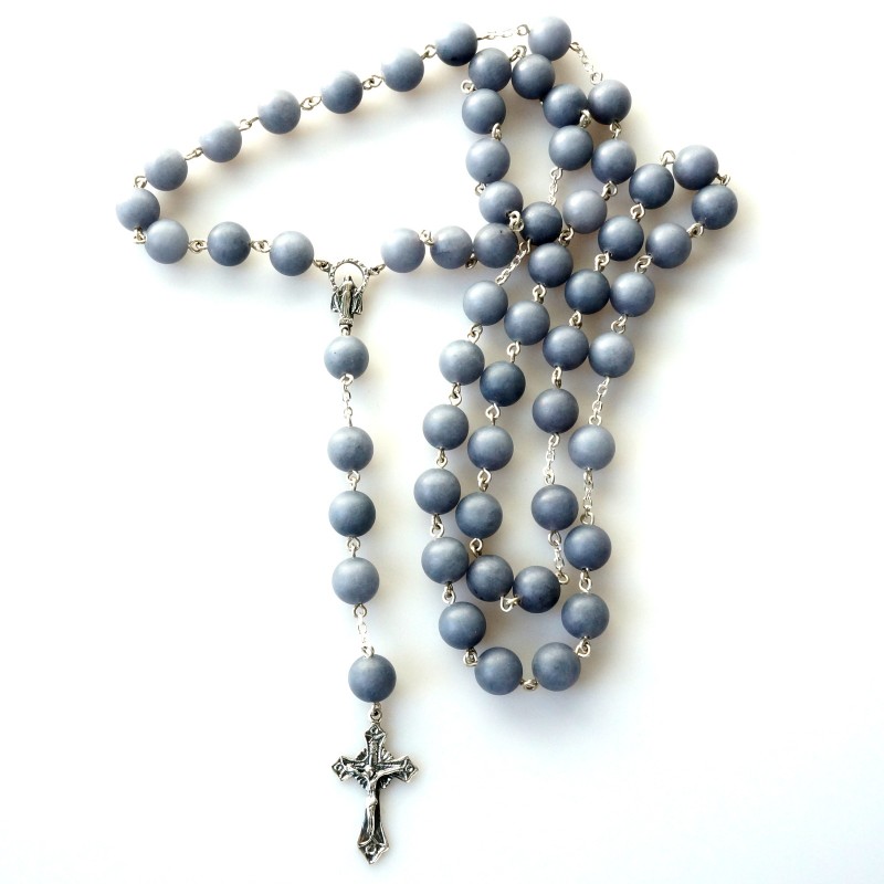 With gray pebbles firmly connected with silver details, adorned with a cross and a medallion of Mary.