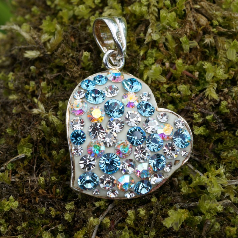 Silver heart with blue, white, yellow Swarovski crystals.